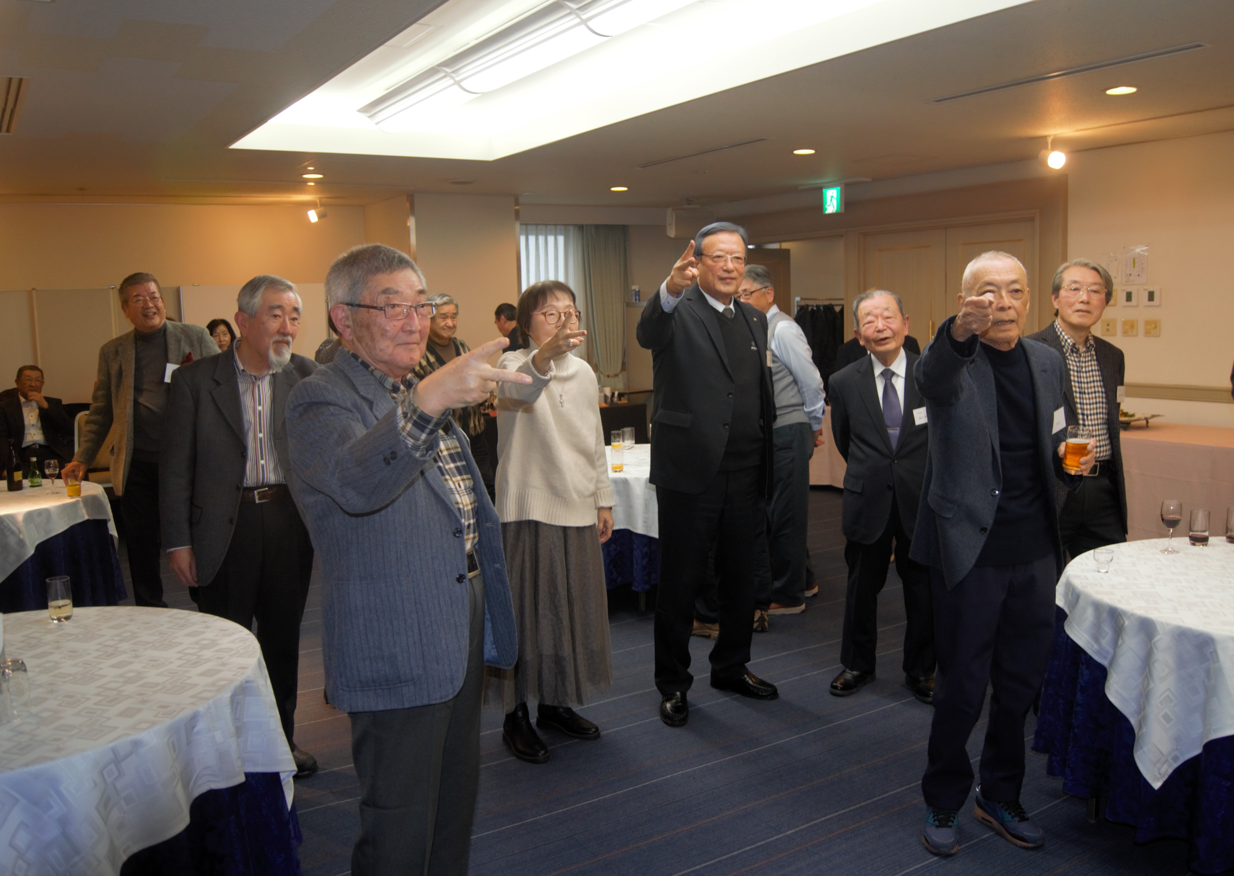 校歌に続き、勝山達志さんが張りのある美声で前説を語り、応援歌と惜別の歌を全員で合唱しました。千種伸夫元会長の中締めでお開きとなり、集合写真を撮り、2次会会場に移動しました。