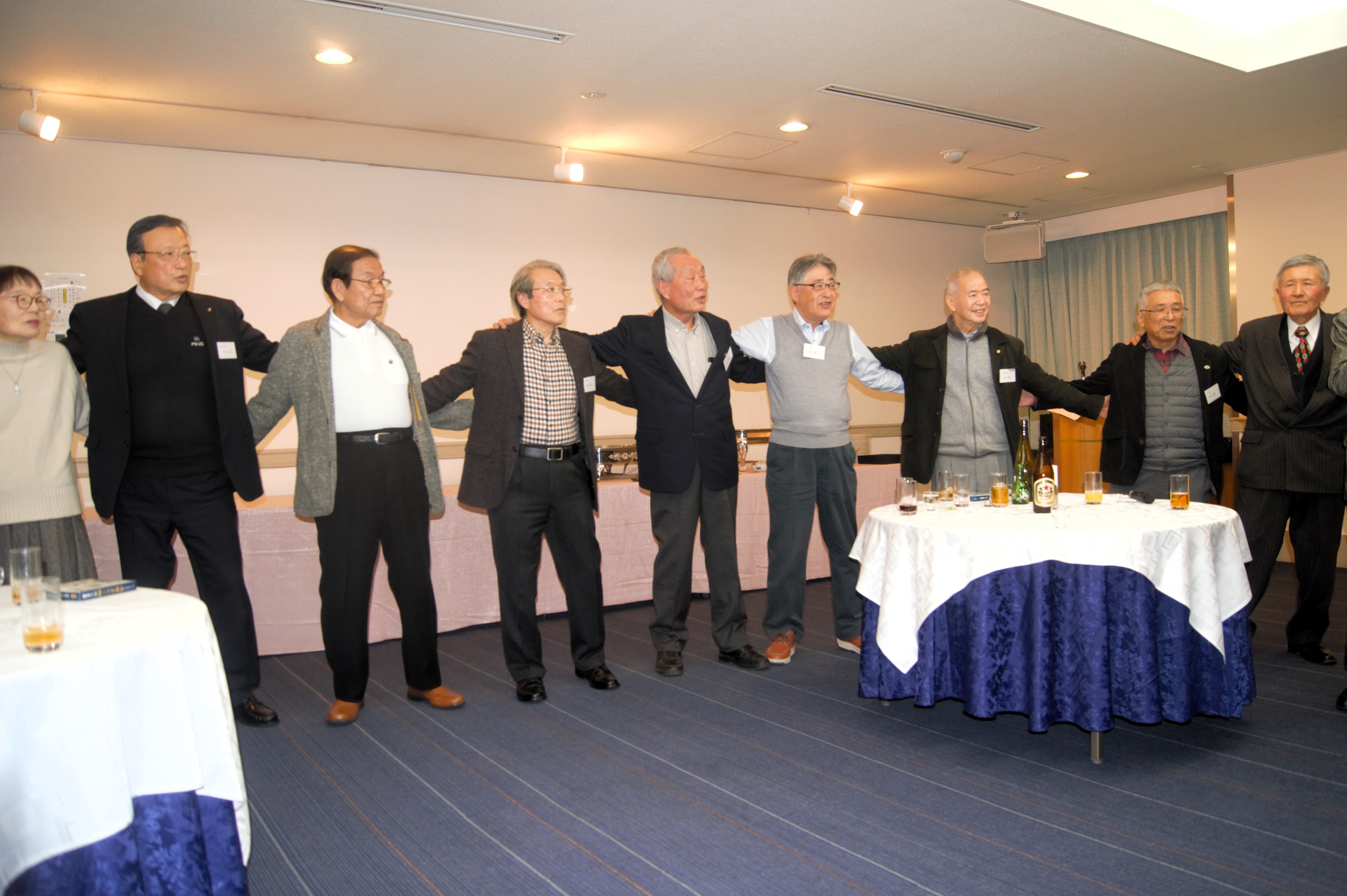 最後は、校歌、応援歌と惜別の歌を皆で肩を組みながら歌い、初代会長の千種伸夫さんの締めの挨拶、集合写真撮影でお開きとなりました。2次会にも約半数が参加しました。